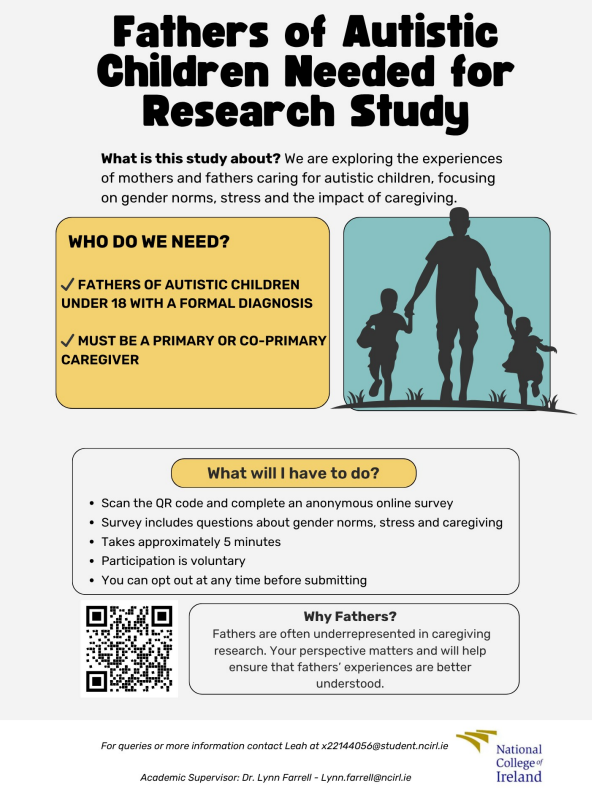 Leah Ward is a final-year student in the part-time BA (Honours) Psychology programme at the National College of Ireland. As part of her Final-Year Project, Leah is carrying out an independent research project – Understanding Caregiver Experiences in Parents of Autistic Children.