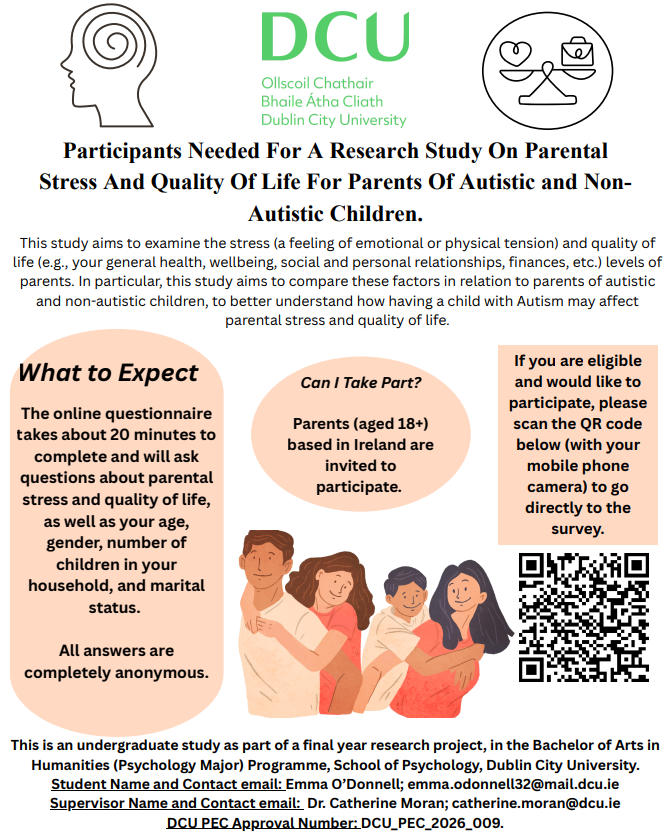 Emma O’Donnell is a final year student in the BA in Humanities (Psychology Major) programme at Dublin City University (DCU). As part of her Final-Year Project, Emma is carrying out an independent research project- A Comparative Examination of Stress and Quality of Life in Parents of Autistic and Non-Autistic Children.