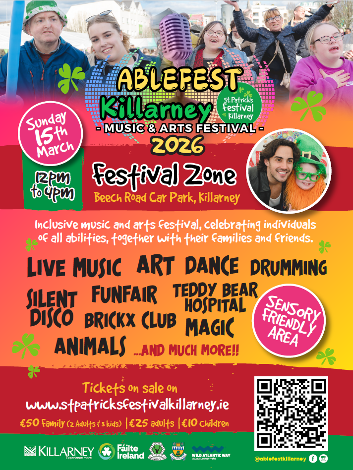 Ablefest Killarney, an inclusive, sensory friendly festival taking place on Sunday, March 15th 2026 in Killarney.